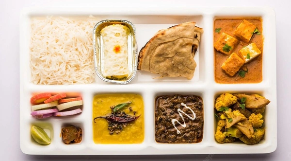 Jeera Rice, Dal, Paratha - 2pcs, Bhaja, Veg Sabji (Any), Paneer Sabji, Sweet - 1pc, Papad, Salad, Pickle